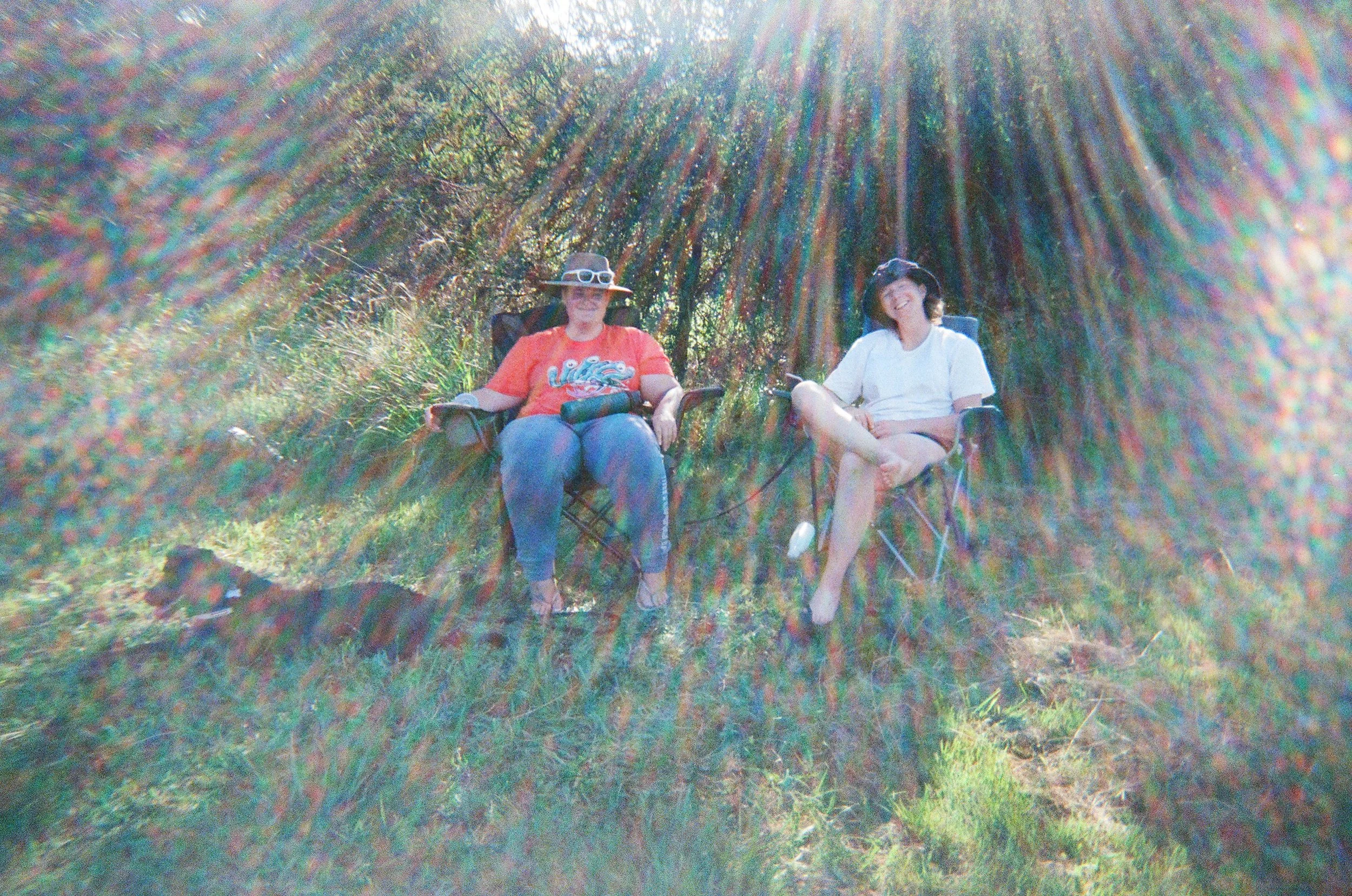 Maddie and I lie on the trampoline at Hoddles Creek. The moon is visible in the blue sky. We yell at the moon to go to bed and come back later.
