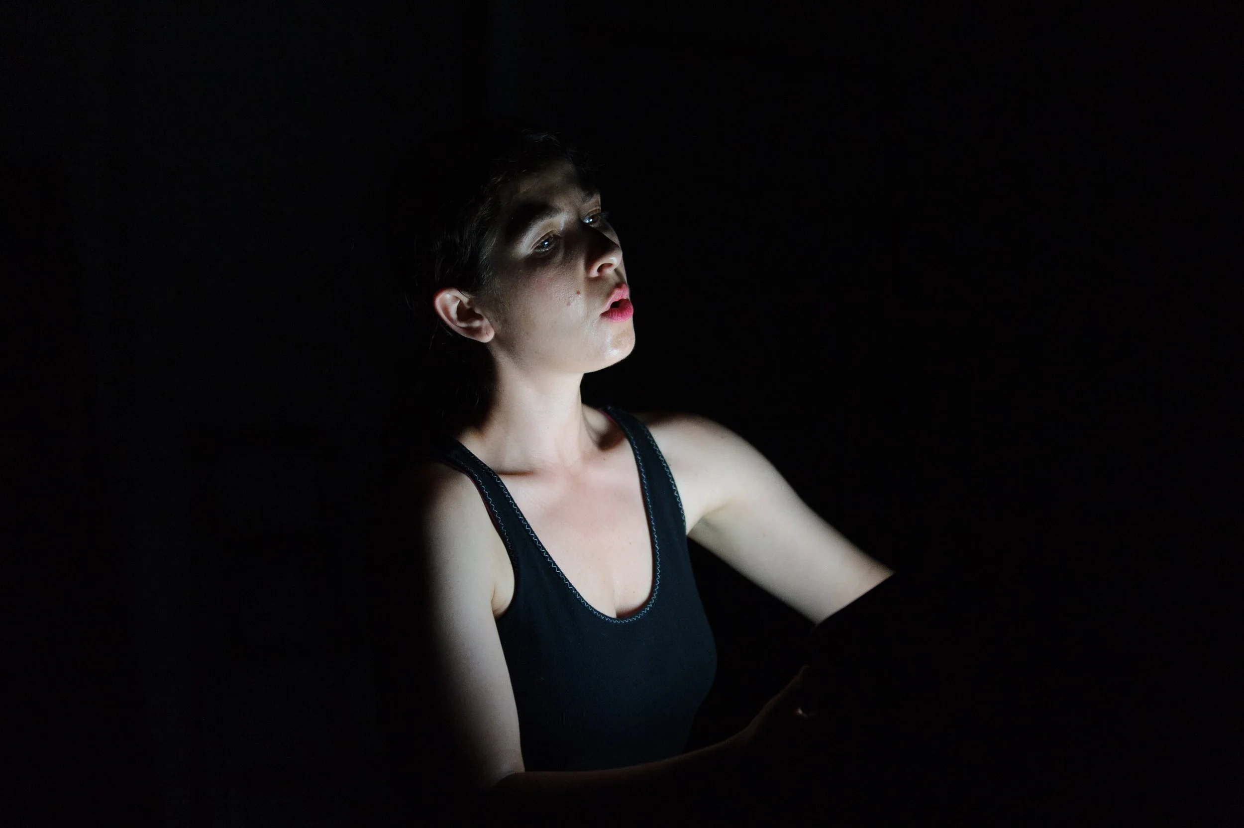 My Self in That Moment opens. Jess, barely lit, roils, her mouth open, the many distended mouths on her costume also open, a scream of birth and fear. Remarkable.