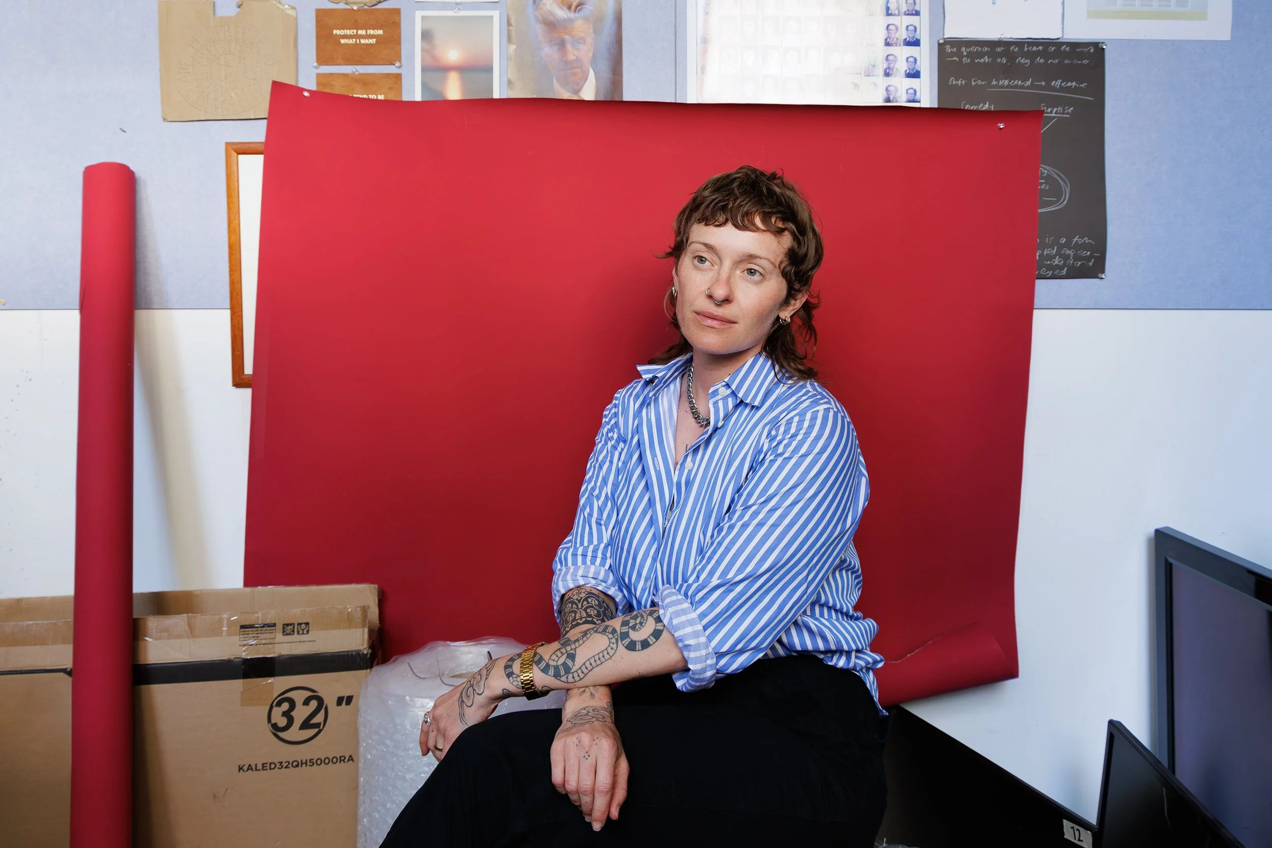 She makes work about anxiety, intimacy and absurdity. She has a particular interest in the body, and the ways in which it escapes our control, as well as how apprehension of disaster impacts our sense of the present.