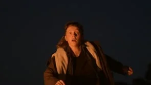 Projected at large scale, Ado (Pillar of Salt) is an unflinching work of observation. It shows a couple fleeing from an unseen disaster. The woman turns, becoming a witness who fails to look away. Reactions of horror and disbelief transition to a determined gaze that continues to watch as the fire illuminating the scene fades to black.